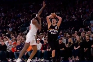 太小瞧我臂展了!约基奇慢悠悠试图撤步三分 米切罗飞身大帽扇飞GIF-米切尔·罗宾逊残暴大帽约基奇三分