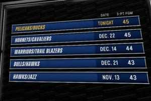 未能再创新高!雄鹿鹈鹕合计命中45记三分 平本赛季单场最多雄鹿主场141-137加时险胜鹈鹕。本场比赛雄鹿三分47中21,鹈鹕46中24,双方合计命中45记三分,平本赛季单场最多。