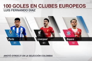 对阵霍芬海姆戴帽后,路易斯·迪亚斯旅欧期间已打进100球体育资讯2月9日讯德甲第21轮,拜仁5-1战胜霍芬海姆,路易斯·迪亚斯戴帽。数据统计显示,路易斯·迪亚斯在旅欧期间俱乐部赛事已经打进了100粒进球,其中波尔图41球,利物浦41球,拜仁18球。